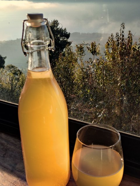 Nuestra kombucha ha sido elaborada en base a té verde fermentado, azúcar rubia, miel, y agua y cristalina proveniente de la montaña en la selva valdiviana.